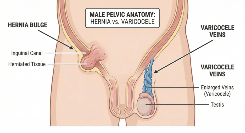 Sementara itu, varikokel berkembang lebih perlahan dan sering tidak disadari pada tahap awal. Varikokel merupakan pelebaran vena di dalam skrotum akibat aliran darah yang tidak mengalir kembali ke tubuh secara efektif. Banyak pria menggambarkan sensasinya seperti berat, tidak nyaman, atau rasa pegal yang makin terasa setelah berdiri lama atau berolahraga. Pada beberapa kasus, varikokel dapat diraba seperti “sekumpulan cacing” yang melilit di sekitar testis — sebuah ciri khas yang cukup membedakannya dari hernia. Walaupun tidak mengancam jiwa, varikokel bisa berpengaruh terhadap kualitas sperma dan kesuburan, sehingga pemeriksaan medis perlu dipertimbangkan jika gejala menetap.
