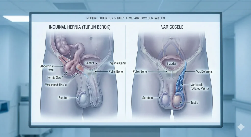 Turun berok dan varikokel sering dianggap sebagai kondisi yang mirip karena sama-sama terjadi di area selangkangan, tetapi sebenarnya keduanya memiliki karakteristik, penyebab, dan risiko yang sangat berbeda. Turun berok adalah kondisi ketika organ dalam tubuh — biasanya usus — menonjol keluar melalui dinding otot yang melemah, sedangkan varikokel merupakan pelebaran pembuluh darah vena di sekitar testis yang menyebabkan aliran darah tidak lancar. Kombinasi gejala yang samar sering membuat orang sulit membedakan keduanya, tetapi memahami perbedaan mendasarnya sangat penting agar tidak salah dalam mengambil langkah penanganan.